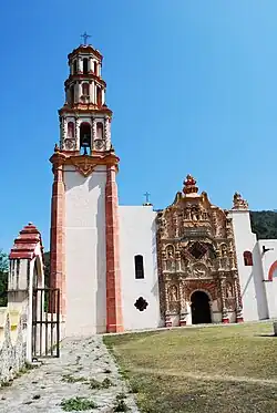 The municipality is home to two of the five Franciscan missions in the Sierra Gorda, which were registered together at a World Heritage Site in 2003.[4] The mission complexes standing today were constructed with stone and mortar under the leadership of Junípero Serra after he took over evangelization of the area in 1750.[3] However, both sites had been Augustinian missions earlier in the colonial period, and the Franciscan missions themselves were founded in the 1740s.[1] After the missions were handed over to regular clergy in 1770, they deteriorated over the centuries. Restoration work on all five churches began from 1979 to 1985, initially focusing on the integrity of the structures and the facades. From 1991 to 1997, restoration of the towns around the missions, including work on monuments, plazas, fountains, building facades, paving streets with stone and more were undertaken. From the late 1990s to the early 2000s, restoration of interiors were done, including to altars, choir areas, organs and paintings.[4] Much of the work was done to encourage tourism to the area, and the work cost anywhere from one to two million pesos for each church.[4][9]