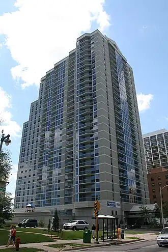 The 28 story building is 350 feet tall and contains 275 condominium units.[4] The tower was built in a modernist style. This building is 248 feet tall from the front entrance, and 350 from the back facade. It sits on a steep bluff.[5] Most units have floor to ceiling windows and balconies with views of the City of Milwaukee and neighboring Lake Michigan. The building contains an indoor pool, a workout room, a putting green, an enclosed parking garage and a two-story main lobby. The building is set on a bluff that overlooks Veterans Park and Lake Michigan.