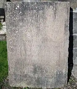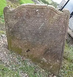 A substantial and ornately carved table-style gravestone in Dunlop churchyard commemorates William Anderson, who died aged 70 on 3 December 179[?]6, and his wife, who died in 1784. The memorial was erected by their son, Robert Anderson of Borland. The stone now rests against the "Picture House" building.