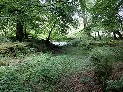 Ordnance Survey maps indicate that the main entrance to Laigh Borland was via the Sandy Ford Lane, which passed North Borland and crossed the Glazert Water. A secondary access branched from the lane to Over Borland and descended the steep lower slope of Borland Hill, entering near the south-eastern corner of the walled garden. A footpath with a stile also connected Over Borland to Laigh Borland.[31]