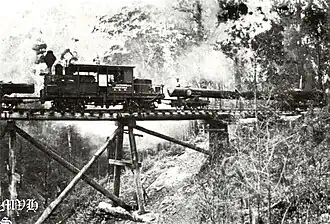 The railway and the sawmill were owned and managed by William Edwin Langley (born 3 February 1860 in Shoalhaven; died 11 Nov 1946 in Taree).[3][4] He joined his father's business (subsequently Langley Bros.) after serving his time as a joiner in 1879. His new sawmill was inaugurated on 3 July 1902.[5] In April 1931 he became president of the Timber Merchants Association.[6][7]