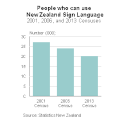 New Zealand Sign Language, the main language of the deaf community in New Zealand, has been an official language by statute since 2006, by virtue of the New Zealand Sign Language Act 2006.[31][32] It is legal to use it and have access to it in legal proceedings and government services. In the 2018 census, 22,986 people (0.5%) reported the ability to use New Zealand Sign Language.[1]