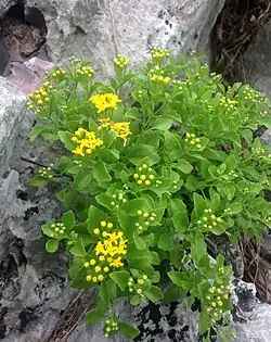 Its natural habitat is in crevices of Cretaceous-age limestone rock, often near streams or springs.[2]