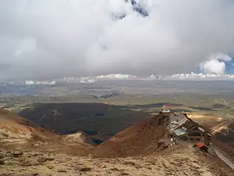 A view of Laram Quta (the largest lake) and Phaq'u Quta (in the distance) from the top of Chacaltaya. Chacaltaya refuge is on the right.