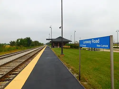 Laraway Road is a commuter railroad station in New Lenox, Illinois, a southern suburb of Chicago, Illinois. The station was dedicated on October 6, 2006,[2] and train service began on October 9, 2006. The station is a stop for Metra's SouthWest Service trains, which go to Chicago Union Station in downtown Chicago. As of 2018, Laraway Road is the 228th busiest of Metra's 236 non-downtown stations, with an average of 19 weekday boardings. The station's rank is tied with the neighboring Manhattan station.[1]