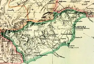 Some northern parts of the present District were at that time included in Famagusta District, namely Arsos, Athienou, Melousia, Troulli, Tremetousia and Pergamos. At the first British Census Larnaca District (i.e. both the caza and nahieh) had a population of 20,766.[7] By 1891 Athienou had been moved to Nicosia District,[8] while the other villages were later moved to Larnaca District. Athienou was united to Larnaca District in the 1920s.[9]
