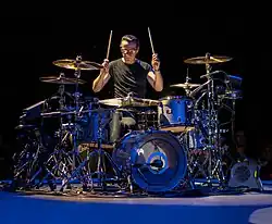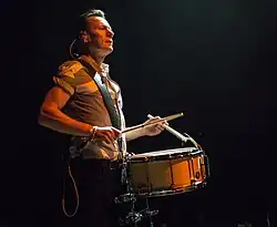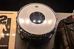 Mullen was heavily influenced by glam rock acts of the 1970s when first learning to play drums.[21] In the early days of U2, he had what Bono called a "florid" drumming style, before he eventually adopted a philosophy of simplicity and pared down his rhythms.[3][24] His drumming leaves open space, owing to what Modern Drummer described as his understanding of "when to hit and when not to hit".[3] As he matured as a timekeeper, he developed a preternatural sense of rhythm; Eno recounted one occasion when Mullen noticed that his click track had been set incorrectly by just six milliseconds.[25] Under the tutelage of Lanois, Mullen learned more about his musical role as the drummer in filling out the band's sound, while producer Flood helped Mullen learn to play along with electronic elements such as drum machines and samples.[21] His kit has a tambourine mounted on a cymbal stand,[26] which he uses as an accent on certain beats for songs such as "With or Without You".[3][27]