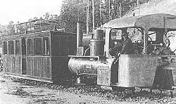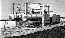 The three locomotives were of the 0-3-0 type, constructed by the Hunslet Engine Company.[3]: 46, 65 They were specially built with two boilers to balance on the track, and consequently two fireboxes, one of which had to be stoked by the driver. They were also fitted with powered tenders for auxiliary use on hills. The tender wheels were driven by two cylinders via spur gears. Two small chimneys were fitted to each tender to discharge the exhaust steam from those cylinders. A smaller engine, nicknamed the "coffee pot", was used in the construction of the railway, having been used previously on a demonstration line at Tothill Fields in London. It can be seen in an early photo of 1888. The rolling stock, both wagons and carriages, were made by the Falcon Engine & Car Works of Loughborough.