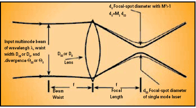 where d00 is the ideal focused spot diameter, f is the focal length of the focusing lens, and D00 is the input beam waist and is placed one focal length from the lens as shown in the figure. However, when a multimode beam is focused, Equation (3) becomes