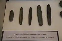 Lat money (Lao: ເງິນລາດ) refers to the bar-shaped coinage minted and used as currency in the kingdom of Lan Xang and its successor kingdoms of Vientiane, Luang Prabang, and Champasak. "Lat" is a Lao abbreviation for "talat" or "market," referring to the small denomination currency which may also be referred to as "boat money" or "Ngern Heua."[1] The bar-shaped coinage of Lan Xang could be differentiated according to shape, weight, metal, alloy, and mint marks.[2][3]