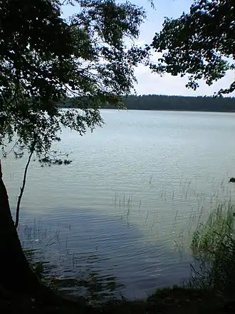 Latežeris lake is located near Latežeris village in Alytus county in southeastern Lithuania. It is located on the edge of the Dainava forest, the largest forest area in Lithuania.[1][2] It lies at an altitude of 105 m (344 ft), near the Belarusian border.[3] The Ratnyčia river originates in the Skleriai swamp about 18 km (11 mi) from Druskininkai. The river flows south through Dubas before turning north and flowing through the lake Latežeris. From the lake, it traverses the border with Belarus, and joins the Nemunas river.[4]