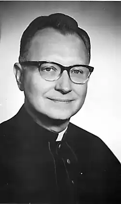 Father Joseph D. Brokhage (S.T.D., ordained 1939, Monsignor 1964) served as both rector of the school and pastor of Holy Rosary parish. Under his leadership, the school grew steadily and added a large wing of classrooms, a recreation room and a gymnasium/auditorium along Stevens Street. An ambitious program was launched in 1963 to build a group of dormitories for out-of-town students. This plan was only partially carried out. The first dormitory, Dugan Hall, was built with funds provided by the Latin School Foundation, a foundation started by the District Council of Catholic Men. Dugan Hall was named for Msgr. Henry Dugan, who had been a member of the advisory board when the school was founded.[2]