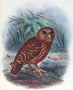 The laughing owl (Ninox albifacies), also known as whēkau, the laughing jackass,[4] or the white-faced owl, is an extinct species of owl that was endemic to New Zealand. Plentiful when European settlers arrived in New Zealand, its scientific description was published in 1845, but it was largely or completely extinct by 1914. The species was traditionally considered to belong to the monotypic genus Sceloglaux Kaup, 1848 ("scoundrel owl", probably because of the mischievous-sounding calls), although recent genetic studies indicate that it belongs with the boobook owls in the genus Ninox.