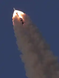 Also under NASA's CCDev program, SpaceX was awarded $75 million for the development of their own version of a "pusher" LAS.[6] Their Dragon 2 spacecraft uses its SuperDraco engines during a launch abort scenario. Although often referred to as a "pusher" arrangement since it lacks a tower, the Dragon 2 LAS removes both the capsule and its trunk together from the launch vehicle. The system is designed to abort with the SuperDraco engines at the top of the abort stack as occurs with a more traditional tractor LAS. The concept was first tested in a pad abort test conducted at SLC-40, Cape Canaveral Air Force Station, on May 6, 2015.[7] SpaceX tested the system on January 19, 2020, during a full-scale simulation of a Falcon 9 rocket malfunction at Kennedy Space Center Launch Complex 39, where it has later launched crews to the International Space Station.[8]