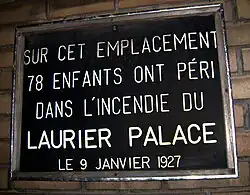 The Laurier Palace Theatre fire, sometimes known as the Saddest fire or the Laurier Palace Theatre crush, occurred in a movie theatre in Montreal, Quebec, on January 9, 1927, killing 78 people.[1][2] The theatre was located at 3215 Saint Catherine Street East, just east of Dézéry St.