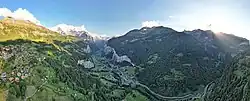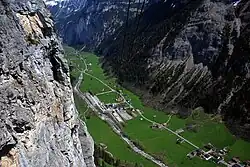 Lauterbrunnen lies at the bottom of a U-shaped valley that extends south and then south-westwards from the village to meet the 8-kilometer (5.0 mi) Lauterbrunnen Wall. The Lauterbrunnen Valley (Lauterbrunnental) is one of the deepest in the Alpine chain when compared with the height of the mountains that rise directly on either side. It is a true cleft, rarely more than one kilometer in width, between limestone precipices, sometimes quite perpendicular and everywhere of extremely steep. In places the cliff walls are up to 1,000 m (3,300 ft) high.[7] It is to this form that the valley owes the numerous waterfalls from which it derives its name. The streams descending from the adjoining mountains and, on reaching the verge of the rocky walls of the valley, form cascades so high that they are almost lost in spray before they reach the level of the valley. The most famous of these is Staubbach Falls, less than one kilometer from the village of Lauterbrunnen. The 297 m (974 ft) high Staubbach is the highest free-falling waterfall in Switzerland.[8] Also near Lauterbrunnen is the highest waterfall in Switzerland, the 417 m (1,368 ft) Mürrenbach Fall.[8] Finally, the Mattenbachfall (cascade waterfall) with a height of 930 meters is Europe's highest waterfall and the third highest in the world.