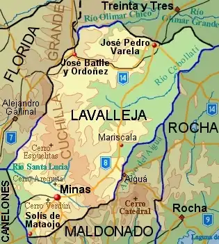 Lavalleja (Spanish pronunciation: [laβaˈʝexa]; locally [laβaˈʒexa, -ʃexa]) is a department of Uruguay. Its capital is Minas. It is located in the southeast of the country, bordered to the north by the department of Treinta y Tres to the east with Rocha, to the south with Canelones and Maldonado, and to the west to Florida.