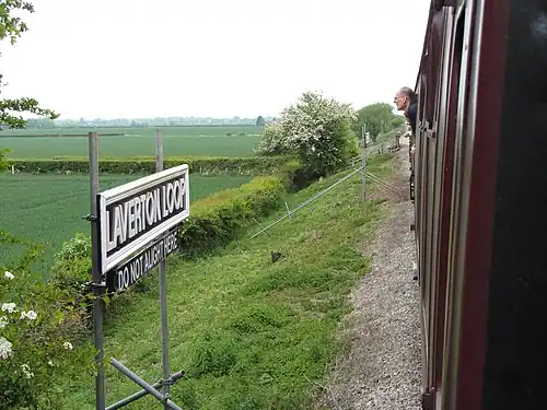 The Heritage Gloucestershire Warwickshire Railway, which is currently in the process of reopening a major section of the Honeybourne to Cheltenham line to Broadway, ran the first train to the site of Laverton Halt on 30 March 2011.[20][21] The halt has not been reinstated, although a run-round loop was constructed at the site. This loop was first used on 9 March 2013,[22] and removed by May 2016 for reuse at Broadway station.