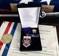A Law Enforcement Purple Heart or Police Purple Heart is a term to describe an American law enforcement medal which may be issued to any law enforcement officer who is injured, wounded or killed in the line of duty.[1] The term is based on the Purple Heart medal issued by the United States Armed Forces. One of the major organizations for the Purple Heart for Law Enforcement is the National Associations of Chiefs of Police who award the Law Enforcement Purple Heart.[2]