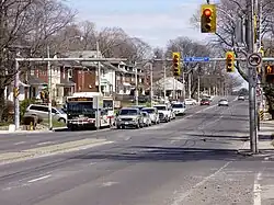 ![]() Westbound traffic waits for a green light at the intersection of Lawrence Avenue East and Mt. Pleasant Road | |||||||