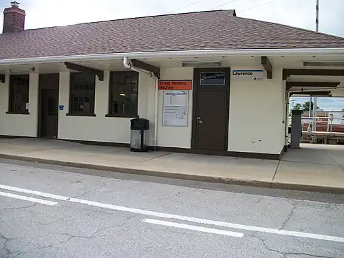 ![]() Parking lot view of Lawrence station. Note the stenciled glass above one of the doorways. | ||||||||||||||||||