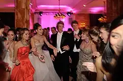 This opening dance is followed by a waltz with all of the fathers and débutantes. The fathers then cede their daughters to the cavaliers, and the waltz is replaced with contemporary music with a live band. The debs then return their dresses and their jewels. The débutantes and their cavaliers finish the evening out clubbing.[66]