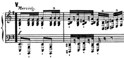 Concludes the first Maggiore variations as the undulating sextuplets move to the bass and the melody moves to the lower treble. The richness of the chords are supported by exotic modulations and references to late Romanticism and Impressionism. Meanwhile, the bass plays very wide broken chords (requiring a supple wrist to play) and arpeggios that end unexpectedly in the next variation.
