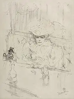 Even though men were discouraged from entering the bar, it was frequented by the painter Toulouse Lautrec, who lived nearby, in 1897–1899. His lithograph, "Au Hanneton", shows Madame Armande at a table inside her bar. She is also depicted in his lithograph La Grande Loge ("A Box at the Theater"), where she is seated at a theater box with bisexual dancer Émilienne d’Alençon.[5] In one biography of Lautrec, Armande Brazier is referred to as "Armande La Borgone" and is said to have treated Lautrec "with maternal affection", while he referred to her as "La Gambetta" after a one-eyed politician because she only had one eye.[6]