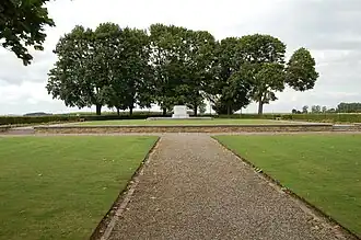 At the end of the war, The Imperial War Graves Commission granted Canada eight sites - five in France and three in Belgium - on which to erect memorials. Each site represented a significant Canadian engagement in the war and for this reason it was originally decided that each battlefield would be treated equally and graced with identical monuments.[1] The Canadian Battlefields Memorials Commission was formed in November 1920 to discuss the process and conditions for a competition that would be held to select the design of the memorial that would be used at the eight European sites.[2] In October 1922, the submission of Toronto sculptor and designer Walter Seymour Allward was selected as the winner of the competition, and the submission of Frederick Chapman Clemesha placed second. The commission selected Vimy Ridge in France as the preferred site for Allward's design as it offered the most dramatic location.[3] Clemesha's 'Brooding Soldier' design was selected for the remaining sites but was later, for a number of reasons, erected only at St. Julien in Belgium. The remaining six sites at Passchendaele and Hill 62 in Belgium and Le Quesnel, Dury, Courcelette and Bourlon Wood in France each received a Canadian granite block memorial marker inscribed with a brief description of the battle they commemorate in both English and French. The blocks are situated in small parks that vary in shape and design and are typically situated on key points of the battlefield they memorialize.
