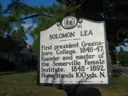 While the Civil War left Leasburg in ruin,[2] many antebellum residences still remain. Famous former residents of Leasburg include Solomon Lea, the son of William Lea and the first president of Greensboro College, and Jacob Thompson, who served under President James Buchanan as Secretary of the Interior. Leasburg was also the birthplace of the short-lived Piedmont blues musician, Carolina Slim.[6]