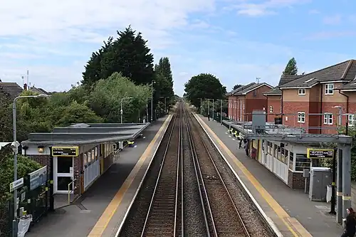 Through electric services to Liverpool Central commenced on 13 March 1938, when the LMS electrified the lines from Birkenhead Park to West Kirby.[5][6] The service was provided by the then-new LMS electric multiple units. However, on Sunday mornings, the service was provided by the older Mersey Railway electric units, which had until then only run from Liverpool to Birkenhead Park.[7] The platform buildings were replaced in 1938, rebuilt in a similar style to those along the line towards West Kirby,[8] and a footbridge was added. The signal box, used to operate the level crossing and replacing a cabin on the westbound platform, was moved to the opposite side of Reeds Lane and was also improved at the time.[9]