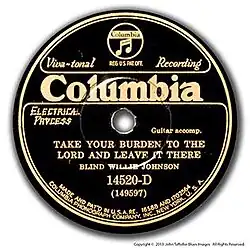 - 1929 – Blind Willie Johnson, "Take Your Burden to the Lord and Leave It There" 10" 78rpm single Columbia 14520-D [6][15]