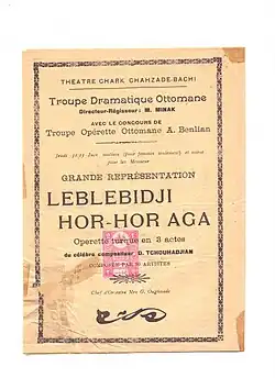 Leblebici hor-hor agha (The Chickpea Seller) or Karine (Կարինե) is an 1875 operetta by the Ottoman-Armenian composer Tigran Chukhajian. Its first performance was in Turkish. It has been claimed as the first original Turkish operetta, though Chukhajian's Arif'in Hilesi (Arif's Trick) was earlier.[1]