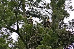 Two mature bald eagles nesting on the shores of Oak Point