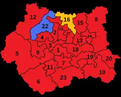 The old constituency was divided between the new constituency (85.7% by area and 50.2% by population of the old constituency) and Leeds Central and Headingley (14.3% by area and 49.8% by population).[10] The new constituency was made up predominantly of parts of the old constituency (62.2% by area and 47.3% by population of the new constituency) and Pudsey (37.7% by area and 52.7% by population), with a small contribution from Leeds North East (0.1% by area and 0.0% by population).[11]