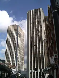 During the 1960s and 1970s, many large concrete tower blocks were built in and around the city centre for residential and office purposes, like many other cities across the UK. Cardinal Telephone Exchange and St Georges Tower, at 84 metres and 82 metres high respectively, are the two tallest skyscrapers in the whole East Midlands region. Many housing association blocks, averaging 55 metres tall with 20 storeys, were also erected in various Council estates – four in Highfields, two in St Matthews and a further two in Rowlatts Hill.