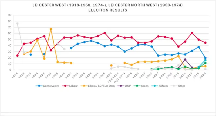 This used to be the safest Labour seat in Leicester; at the 1983 general election it was the only one to remain in Labour hands. However, the high South Asian populations in Leicester South and Leicester East have tended to push them away from the Conservative Party; conversely, while Leicester West is still a safe Labour seat and has been represented by that party since the Second World War, it has become the most marginal of the three Leicester seats.[3] While it did, like the other two Leicester constituencies, see a significant swing to Labour in 2017, Liz Kendall's majority was not a record high for the constituency, unlike with the results in Leicester East and Leicester South. However, Leicester West was the only Leicester seat to remain in Labour hands after the 2024 general election, with Leicester East becoming the sole Conservative gain of the election, and Leicester South won by independent candidate Shockat Adam.