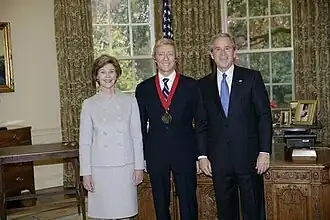 President George W. Bush and First Lady Laura Bush stand with 2005 National Humanities Medal recipient Leslie Keno on November 10, 2005, in the Oval Office.