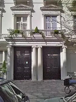 Leinster Terrace's east side is Craven Hill Gardens and Lancaster Gate with one exception, its first numbers. These are today in its centre, 16, 17 and 17A: one of which is a listed public house, the Leinster Arms.[4] The street starts opposite Hyde Park with the side elevations of Porchester Lodge/Lancaster Corner (synonym: 100-101 Bayswater Road) which is listed in the middle category (Grade II*) and is marked with a blue plaque to once long-resident writer J. M. Barrie (d. 1937) who wrote Peter Pan.[5][6] Adjacent, on the west side of the street, is Hyde Park Towers, an eight-storey, dark-brick, Art Deco-inspired block with hexagonal and lozenge projections. This is behind a narrow band of trees, shrubs and railings. Beyond this are shophouses of yellow-brown then yellow brickwork with a crowning cornice (ledge), other white dressings and sash windows (19-34 consecutive), many of which face the main front of Corringham, an architecturally listed, glass-heavy residential block officially in Craven Hill Gardens, designed by Kenneth Frampton (born 1930, in later life, Ware Professor of Architecture at Columbia University), behind which is a private garden.[7][8] These shophouses are flanked by one-storey restaurants (nos. 18 and 35). A broad alley marks the end of the Leinster Terrace section of the street.