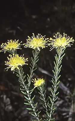 Leionema diosmeum is a shrub to 2 m (6 ft 7 in) high with smooth branches, leaves usually needle-shaped or occasionally oval to lance shaped,0.4–2 cm (0.16–0.79 in) long, 1–4 mm (0.039–0.157 in) wide, rounded apex, upper surface smooth or covered in soft thin individual hairs or rarely fine rough hairs, lower surface with coarse star-shaped hairs. The inflorescence is a compact head at the end of branches, each flower in axils of linear bracts about 5 mm (0.20 in) long on a thick pedicel 1–2 mm (0.039–0.079 in) long, calyx is an inverted top shape and deeply lobed. The flower petals a creamish-yellow, light red on the outside toward apex, 4–7 mm (0.16–0.28 in) long with occasional hairs tipped with glands. The fruit are upright, about 4 mm (0.16 in) long with an angled beak. Bears clusters of yellow flowers in spring.[2]