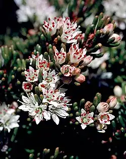 Leionema montanum, is a small shrub with terminal clusters of white-pink flowers in upper leaf axils in spring. It is endemic to Tasmania.