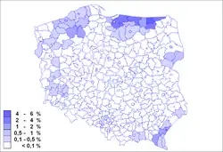 Ukrainians in Poland, 2002. Note strong presence in the Recovered Territories in the north and west, due to forced resettlement during Operation Vistula.