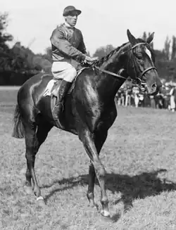 ![]() Lemonora, ridden by Joe Childs, after winning the Grand Prix de Paris 1921 | |