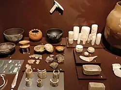The late Palaeolithic period is represented by stone tools that were found mainly in the sand dunes at Santa Cruz and Cambelas in the Torres Vedras municipality. A major Mesolithic site in Portugal is also located in the municipality, in the dunes at Ponta da Vigia. Numerous Neolithic and Chalcolithic sites have provided items for the museum’s collection, particularly domed tombs. Vessels of the Bell Beaker culture from around 2800 BC are also well represented. Noteworthy are items from the Mesolithic necropolis of Cabeço da Arruda, located south of Santarém in Portugal, as well as various Phoenician items from the Iron Age from around 700 BC, giving rise to the belief that an Iron Age settlement existed in Torres Vedras that had trade contacts with the Phoenicians. In the Roman section, in addition to remains of ceramics, mosaics, jewellery and metal objects from Roman villas in the area, there are also a number of inscribed stones. From the early Middle Ages comes the museum’s collection of tombstones.[1]