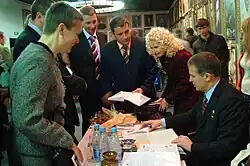Leonid Kadenyuk signs his book, Mission – Space, at the Ukrainian House Convention Center in Kyiv, 2008.