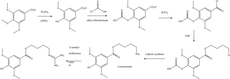 Leonurine can be synthesized starting from eudesmic acid. Reaction with sulfuric acid produces syringic acid. Protection with ethyl chloroformate followed by reaction with thionyl chloride (SOCl2) and then tetrahydrofuran yields 4-carboethoxysyringic acid 4-chloro-1-butyl ester. The chloride is then converted to an amino group via a Gabriel synthesis (with potassium phthalimide) followed by hydrazinolysis (Ing–Manske procedure). The final step is reaction of the amine with S-methylisothiourea hemisulfate salt.