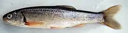 Adult size of southern leatherside chub varies between 10 and 110 mm (0.39 and 4.33 in) standard length.[6] The body is covered with very small scales over a skin with a leathery texture, inspiring the common name.[7] Overall coloration is bluish dorsally and silver ventrally; males are distinguished by patches of orange-red color on the axils of the paired fins, at the base of the anal fin, and along the lower lobe of the caudal fin, as well as golden-red specks at the upper end of the gill opening, and between eye and upper jaw. Unlike most other minnows, both dorsal and anal fins have eight rays.[7][4] This species also exhibits a fusiform body shape with forked homocercal caudal fins. Although southern and northern leatherside chub are similar, the rostrum of the southern leatherside chub comes to a more defined point than the northern leatherside chub.[2]