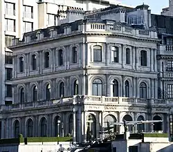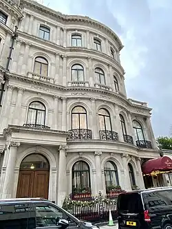 The building at 5 Hamilton Place was built between 1807 and 1810 by Thomas Leverton and remodelled in the Venetian Renaissance style by W. R. Rogers of William Cubitt for Leopold de Rothschild.[1] Interior decoration in the Louis XV and fin de siècle style was completed by John Jackson, Mellier, Forsythe. The interior is noted for its fine workmanship, including an oak staircase with excessively scrolled balustrade.[1] The woodwork in the library was completed in the Florentine studios of Chevalier Rinaldo Barbetti.[2] It is listed Grade II* on the National Heritage List for England.[1] The oval ceiling fresco in the Marble Room was painted by Edmund Thomas Parris in the 1830s.[3]