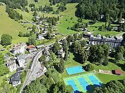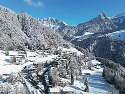 Les Avants is a winter resort in the Vaud Alps. The village was developed as a ski resort in the 19th century by the Dufour family. They constructed the ski slopes and built a hotel, Grand Hotel des Avants, to accommodate visitors. In 1872, an Anglican chapel was built in the grounds of the hotel for the benefit of English visitors.[1] The village hosted the first Ice Hockey European Championship, in 1910 and gives its name to the Chemin de fer Les Avants – Sonloup. Opened in 1901 as the first stage of the Montreux–Lenk im Simmental line, it connects Montreux to Les Avants and Sonloup, 0.5 km (0.31 mi) to the northwest. The hotel closed after the Second World War and has since served as a school, currently Le Châtelard international boarding school. Ernest Hemingway stayed at the resort in the 1920s, and recalls the village in his memoir, A Moveable Feast.[2]
