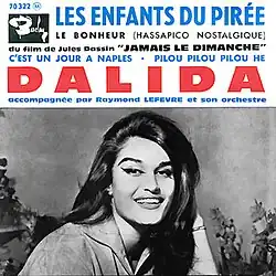 "Les Enfants du Pirée" ("The Children of Piraeus") is a French song by singer Dalida, first released on EP in June 1960. It was a big international summer hit and remained one of major successes of her career. The song comes from the Greek movie Never on Sunday (Pote tin Kyriaki), nominated for 8 Oscars and won an Oscar for the music of Manos Hadjidakis, sung by Melina Mercouri who starred in the movie along Jules Dassin.